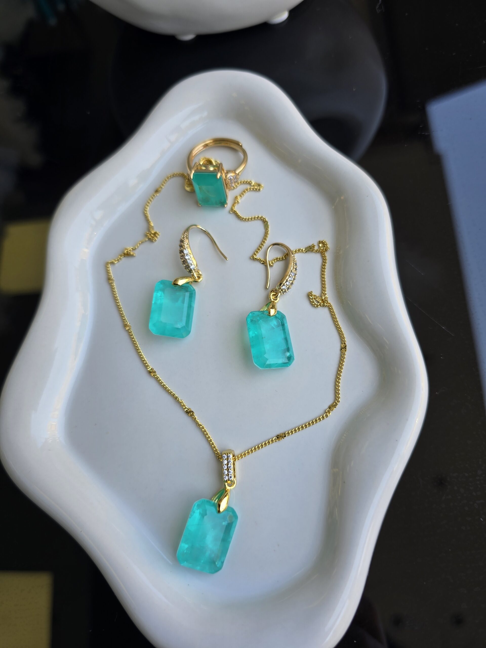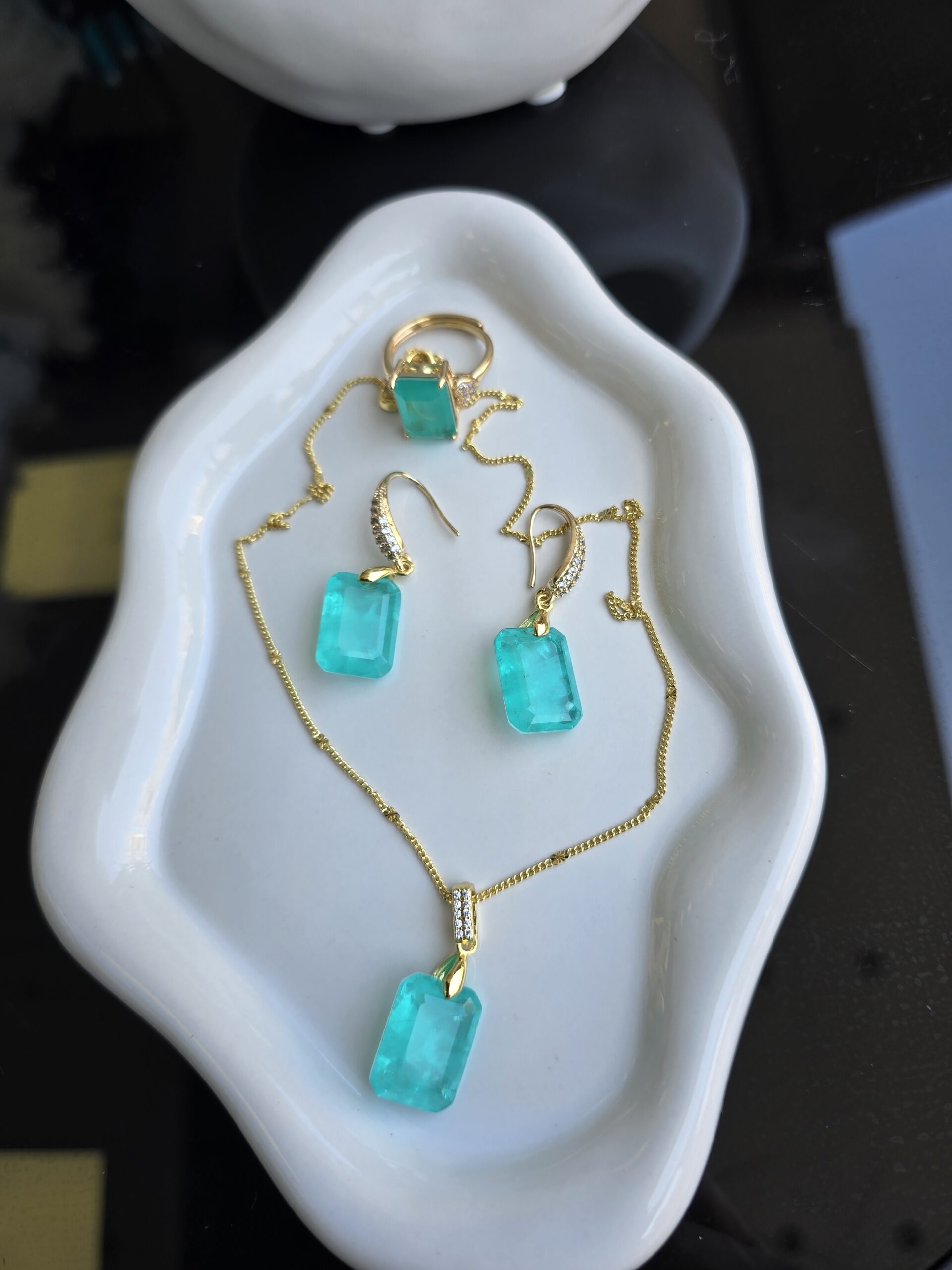 Εντυπωσιακό σετ με τιρκουαζ κρύσταλλα που κλέβει τις εντυπώσεις, ιδανικό για τις καλοκαιρινές σας εμφανίσεις. Υπόαλλεργικα.